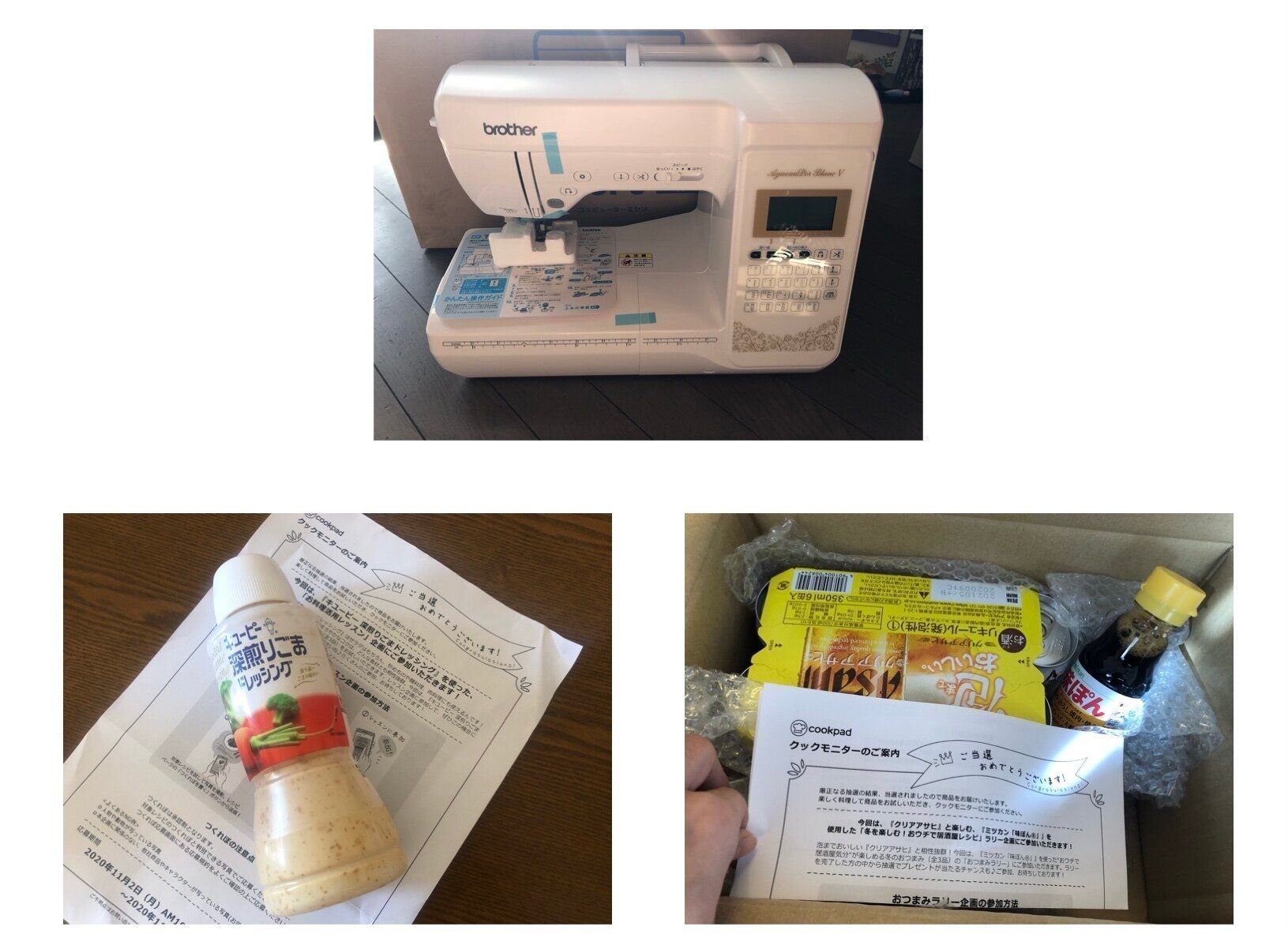 まずは、最近の私の当選品をご紹介します!実は最近、65,000円以上するコンピューターミシンを当ててしまいました!今までの当選品の中でも、かなりの高額当選品です。そして、発泡酒やインスタントラーメン、牛乳、カフェオレ、ポン酢、ドレッシングなどなど、食料品はほぼ毎週当選しています!