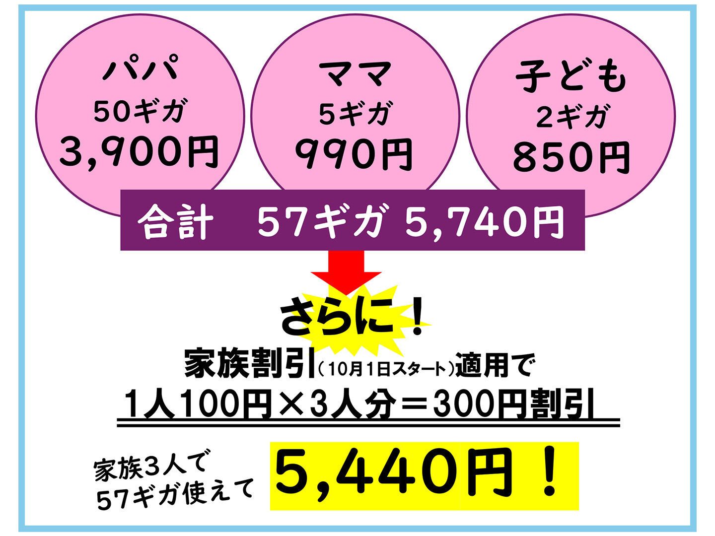 その通信料が驚き! 2ギガ850円、5ギガ990円と1,000円を切り、50ギガでも3,900円。しかも家族で申し込めば、ギガをシェアできて賢く使える上に、家族割引(10月1日からスタート)で全員100円割引だから、パパ50ギガ+ママ5ギガ+子ども2ギガならなんと!家族3人で5,440円。うれし涙が出ます…。