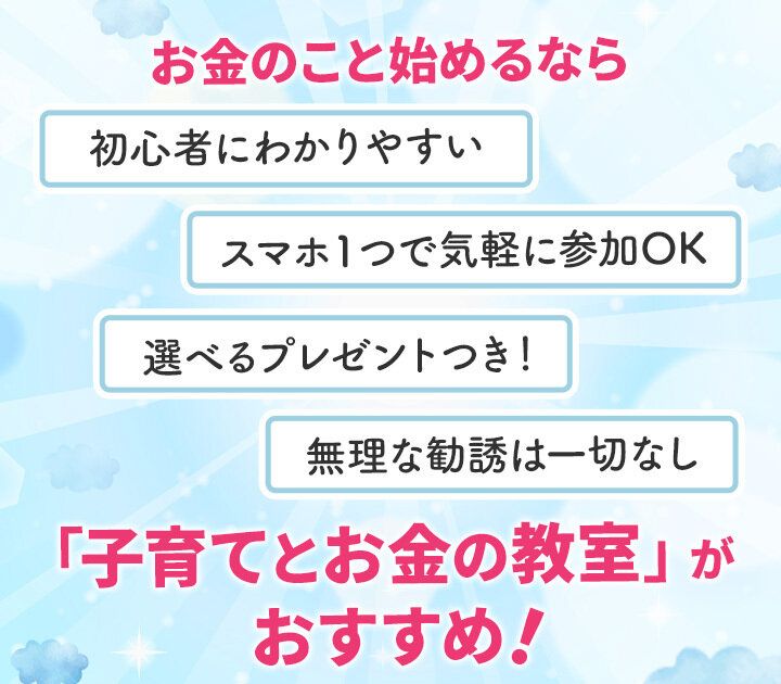 「子育てとお金の教室」は、お金初心者ママに特化されたオンライン教室です。だからとってもわかりやすい! 子どもの教育費のこと、将来のために備えるお金のこと、保険や住宅ローンまで、ママが知っておきたい賢いお金の貯め方、使い方をちゃんと教えてくれるから、受講者の満足度は97%! 年間1万人が受講する大人気セミナーなんです。