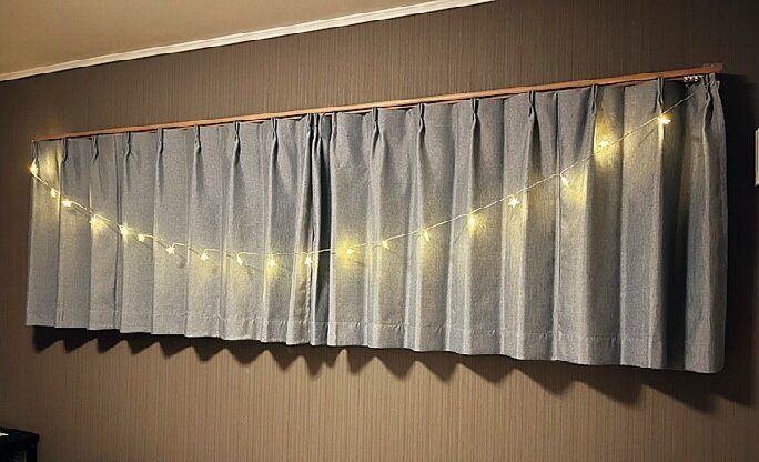寝る前は、部屋の電気を消してカーテンレールにつけた300円のLEDガーランドライトをON。電気代を抑えられるし心もリラックス。