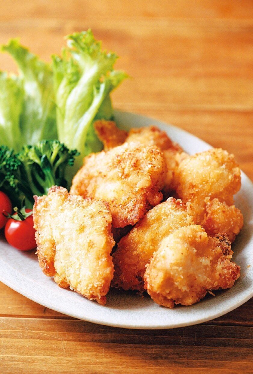 〈作り方〉食べやすく切った鶏胸肉400gをポリ袋に入れ、酒、マヨネーズ各大さじ1、しょうゆ、砂糖、顆粒鶏ガラスープの素各小さじ1、塩、チューブにんにく各小さじ1/2 を加えてもみ込み、15分おく。片栗粉大さじ3を加えてもみ込み、パン粉適量をつけて揚げ焼きにする。