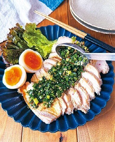 〈作り方〉耐熱容器に鶏胸肉1枚を入れ、フォークで両面に穴をあけ、酒、砂糖各大さじ1、塩小さじ1をもみ込む。ピタッとラップをして30分おき、ラップをふんわりし直して電子レンジで4分30秒加熱する。扉を開けずに30分おき、食べやすく切る。みじん切りのにら50g、しょうゆ大さじ2、ごま油大さじ1 1/2 、酢、砂糖、水、白ごま各大さじ1、チューブにんにく、コチュジャン各小さじ1/2 を混ぜ合わせたたれをかける。