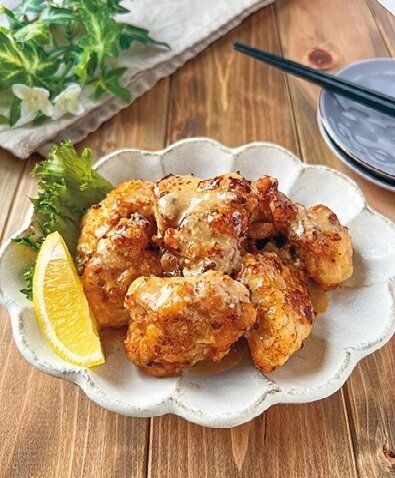 〈作り方〉食べやすく切った鶏胸肉300gをポリ袋に入れ、酒大さじ1、しょうゆ小さじ2、砂糖、チューブにんにく各小さじ1/2 を加えてもみ込む。鶏肉を小麦粉大さじ4、溶き卵1個分の順にくぐらせ、揚げ焼きにする。マヨネーズ大さじ3、酢大さじ2、砂糖大さじ1 1/2 、しょうゆ大さじ1を泡立て器で混ぜ合わせたたれをかける。