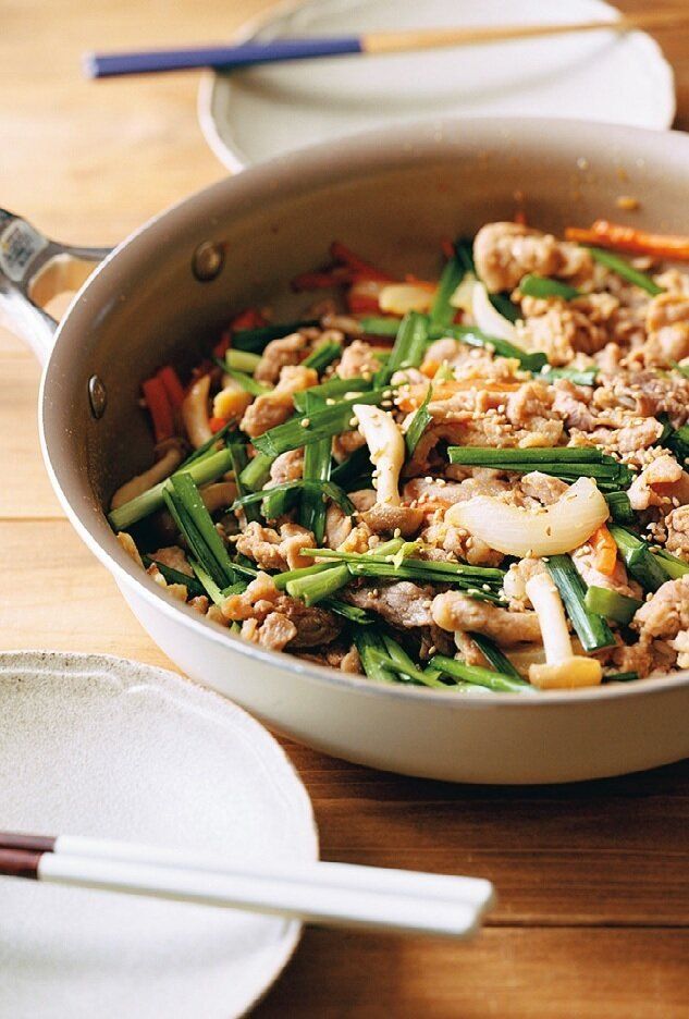 〈作り方〉ポリ袋に豚こま切れ肉400gを入れ、しょうゆ大さじ2 1/2 、砂糖、コチュジャン各大さじ1 1/2 、酒、みりん、ごま油各大さじ1、チューブにんにく小さじ1を加えてもみ込み、10分おく。細切りにした玉ねぎ1個、にんじん1/3本を炒め、豚肉としめじ30gを加えてさらに炒める。肉に火が通ったら幅3cmに切ったにら1/2束を加えてサッと炒め、白ごまをふる。