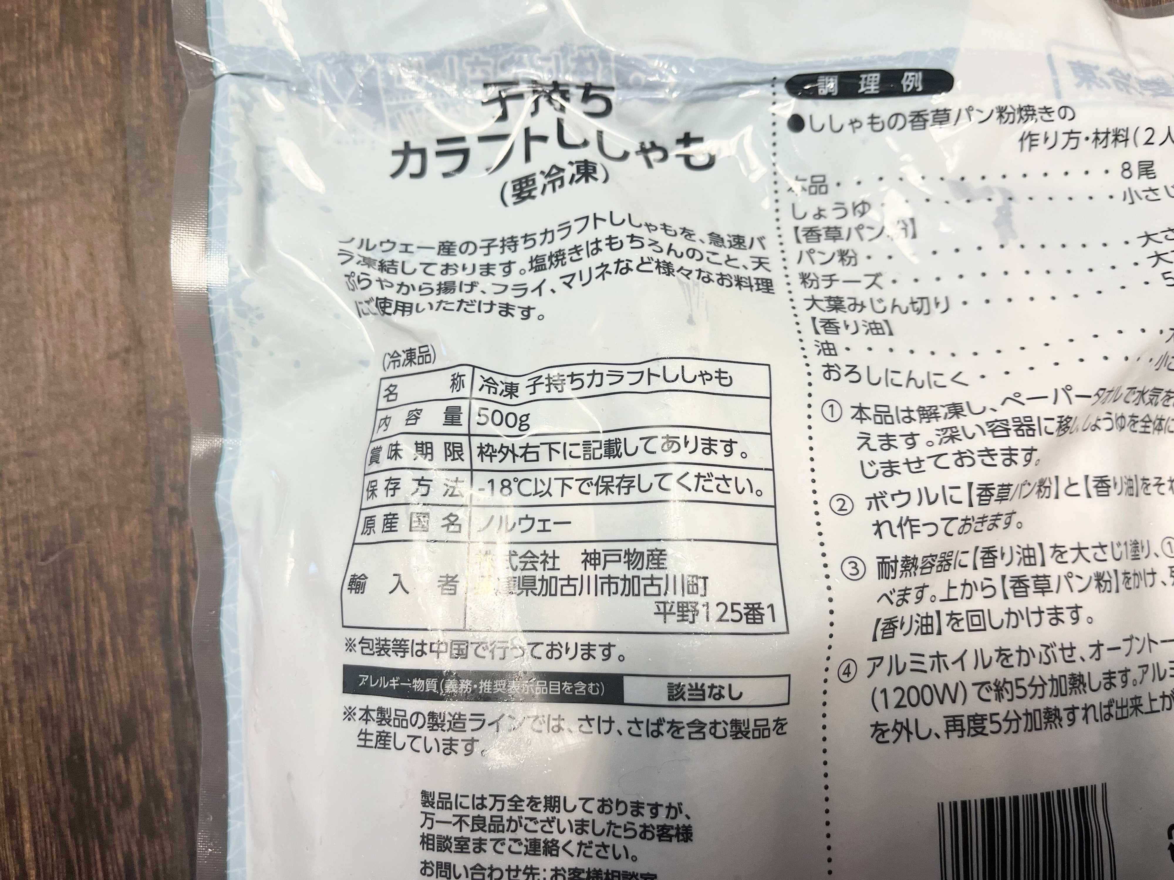 続いては、お魚が丸ごと食べられる冷凍子持ちカラフトししゃもです。