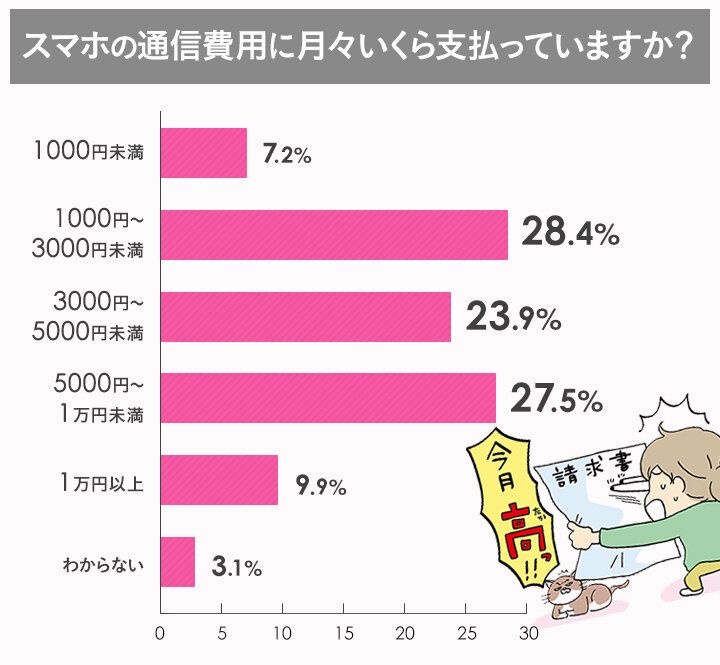 サンキュ!調べの結果では、1000円~3000円未満と月々5000円~1万円未満の通信料を払っているという安い人と高めの人がほぼ同率で2分化していることがわかりました。