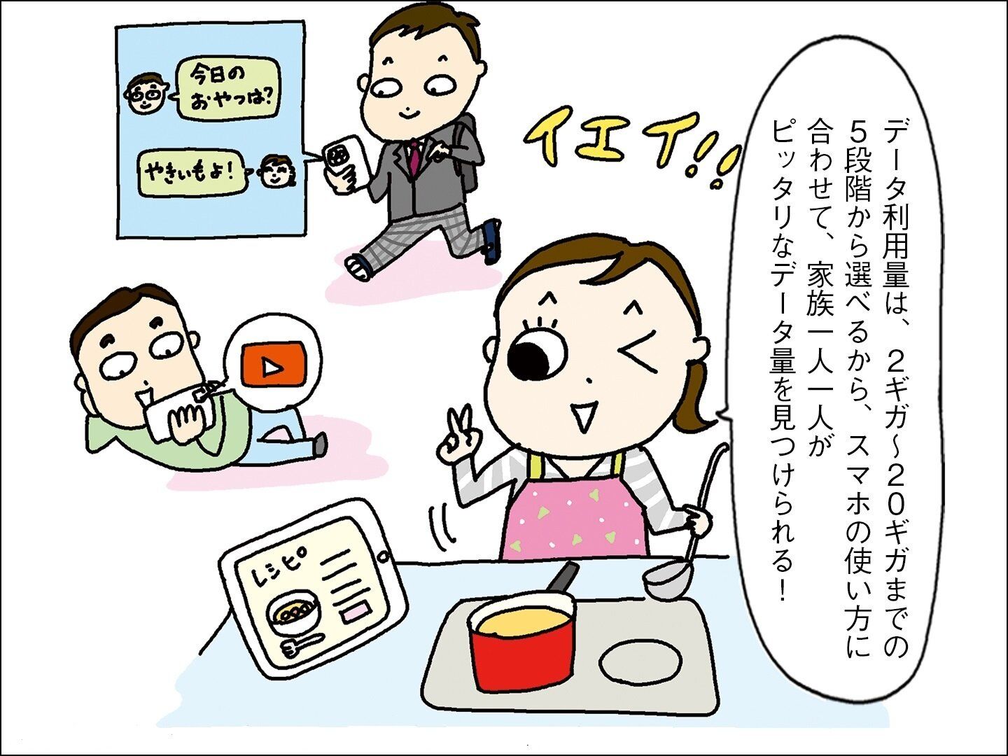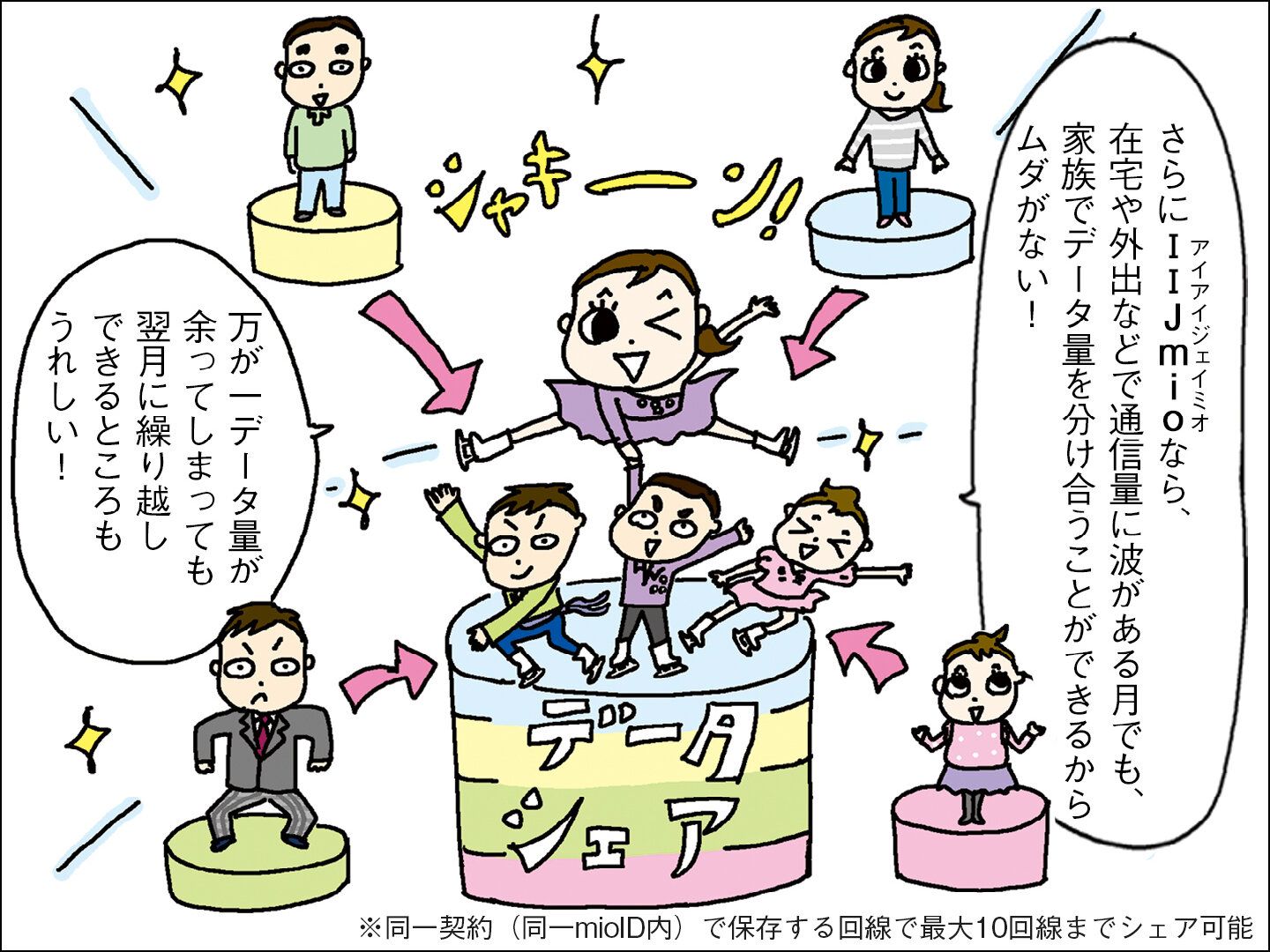 家族内でのデータシェアがおすすめ。家族の誰かのデータ容量が足りなくなっても追加購入が必要なし!