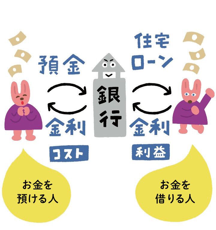 そうなんです。だから今回はその重要な金利がテーマなんですよ(笑)。少しむずかしい表現でいうと、銀行が預金者に支払う金利(=利息)は、銀行にとってお金の「調達コスト」になるんです。預金金利というコストを払って住宅ローン金利という利益を得ることが、銀行の基本的なビジネスモデルというわけです。