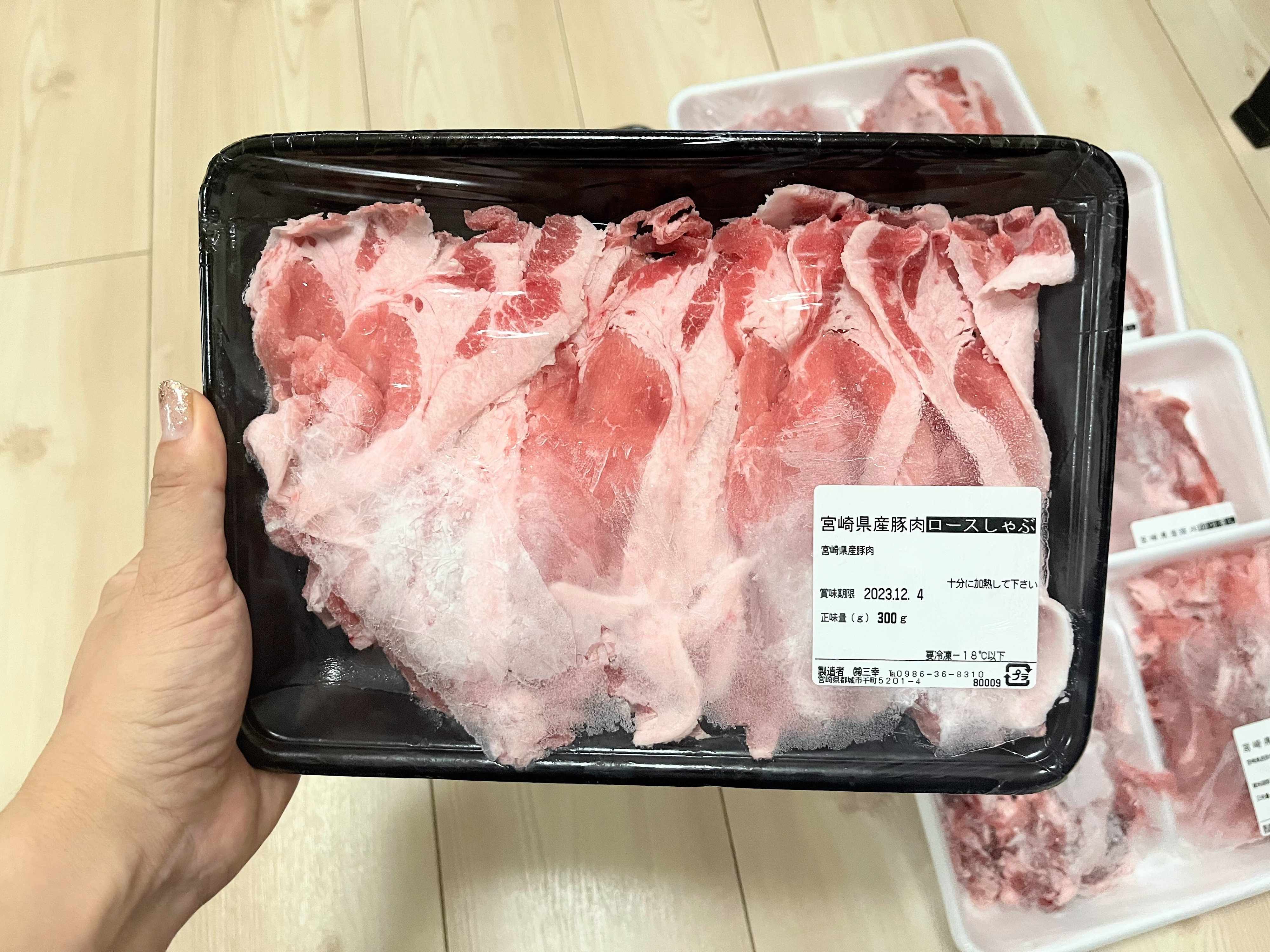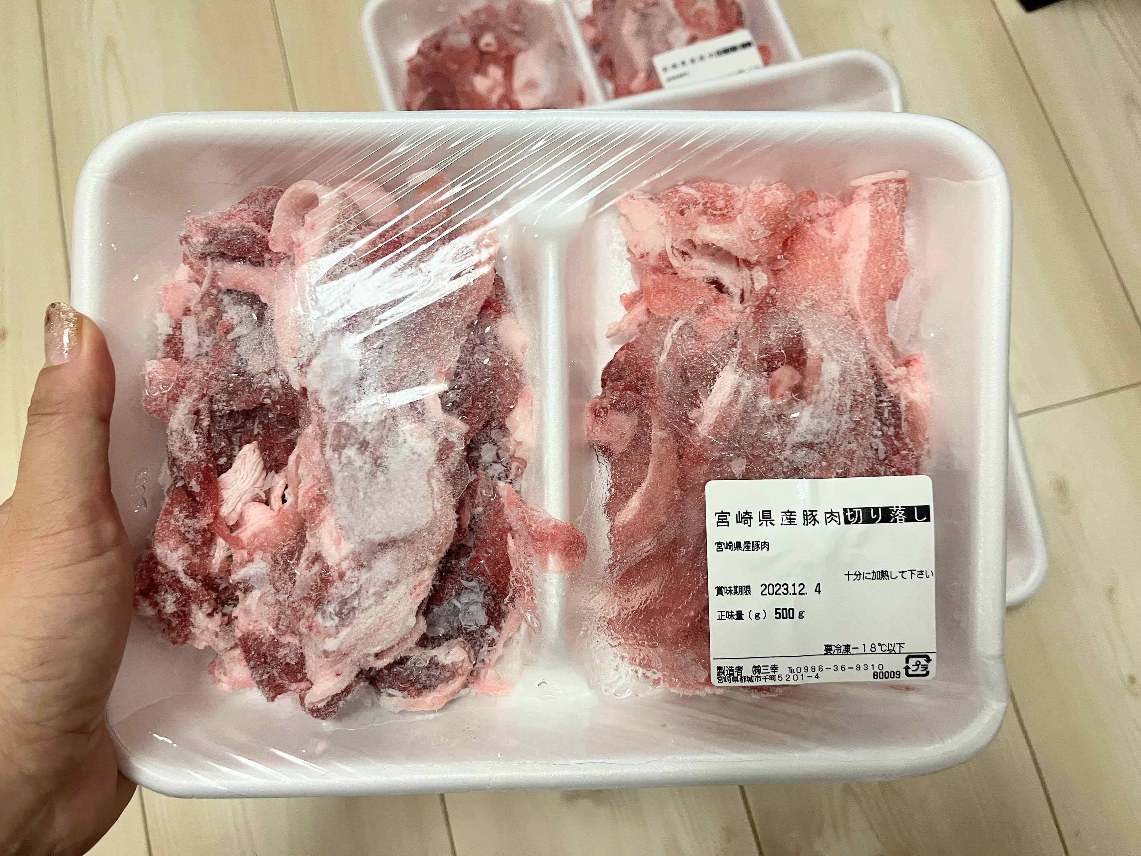 豚の切り落とし肉は500g入りが4つ届くのですが、あらかじめ250gずつに仕切られたトレーに入って届きます。トレー自体が割れるようになっているので、半分に割れば250gだけ解凍して調理することができ、とてもつかいやすい!