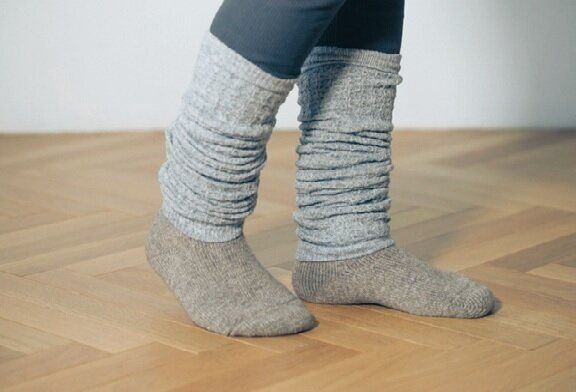 (足首)「ヤク混 レッグウォーマー」(グレー)¥1,490、「足なり直角 履き口やわらか ヤク混 ルームソックス」(モカブラウン柄)¥1,490、「足なり直角 再生ポリエステル ボアフリース ルームソックス」(ライトピンク)¥590