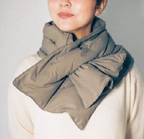 (首)「巻く毛布 マフラー」(ダークグレー)¥990、「再生ポリエステル混 裏フリース ダウンマフラー」(グレイッシュブラウン)¥2,990、(手首)「再生ポリエステル ボアフリースハンドウォーマー」(ペールブラウン)¥990