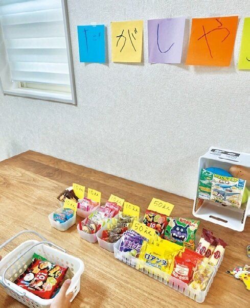 まとめ買いしたお菓子に値段をつけて並べ、実際にお金をやりとりしながら駄菓子屋さんごっこ。「毎日10時と15時にオープンし、お菓子がなくなるまでこのまま放置(笑)」。