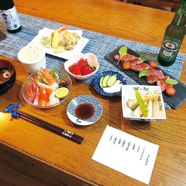 サイトで温泉旅館の料理画像をチェックし、メニューや盛りつけ、並べ方などをそれっぽく演出。「無料のテンプレートでお品書きも作れば、家族のテンションがさらにアップ!」。
