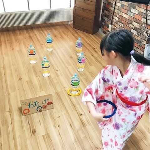ペットボトルを的にした輪投げの輪っかは、細く丸めた新聞紙にビニールテープを巻いて輪っか状にするだけ。「家族で浴衣や甚平で1日過ごし、旅館気分を満喫します!」。