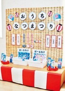 すだれや赤と白の画用紙で、お祭りっぽい雰囲気に。ネットのフリー素材や無料の文字入れアプリで、お金をかけずにデコ。