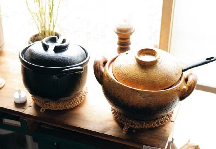 ご飯を炊く鍋と汁もの用の鍋は食卓近くの棚の上に。「見た目が気に入っているから出しっぱなしでも気になりません。目に入るたび癒やされます」。