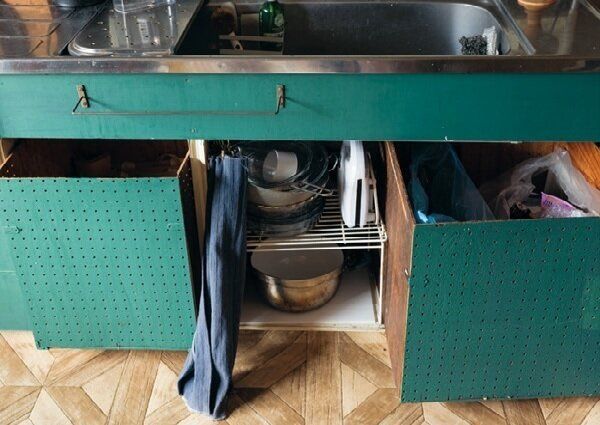 シンク下の扉を外してゴミ箱をセット。「古い台所ですが、古いからこそ、ためらいなく扉を取ってプチDIY。“どうなってたら最高?”を合言葉に、家を自分に合わせてます」。