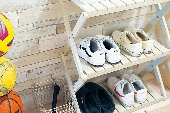 普段履きは玄関のたたきに置いてよし。替えの靴は玄関脇のオープン棚に1足だけ。靴箱に収納するのも1足まで。「靴は全員3足以下」ルールなら5人家族でも玄関周りがスッキリ。
