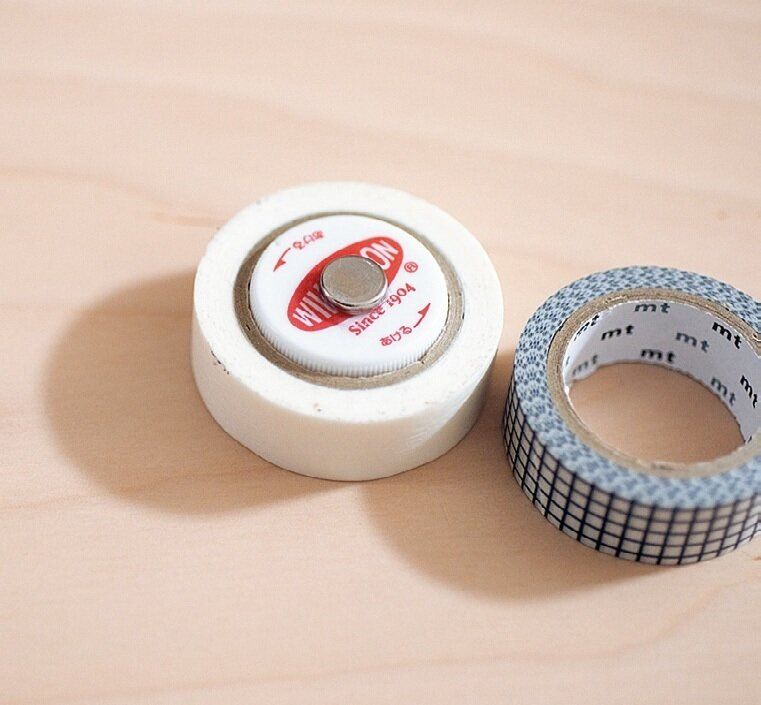 マステの内径(穴)とペットボトルのふたがぴったりって知ってました?そこでふたに接着剤で強力磁石をつけ、そのまま冷蔵庫にペタッ。