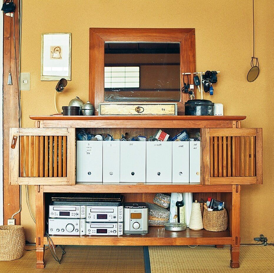 リビングに散らかりがちな物は、扉付きの棚へ。ジャンル別にファイルボックスに分け、「薬」「裁縫道具」などラベルを貼って中身がすぐ分かるようにしています。