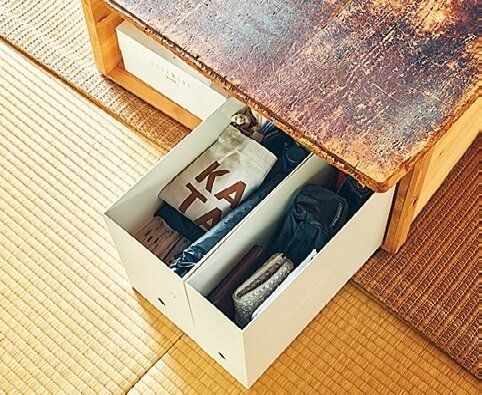 • かばんの中身はテーブルの下の箱にぜんぶ入れる
