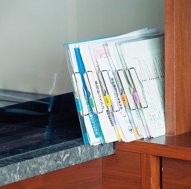 増え続けるプリントは、学校、学童などのカテゴリー別にクリップボートに挟む方式。いちばん上が最新のプリントになるから、処分するときは下のほうをごっそり捨てればOK。