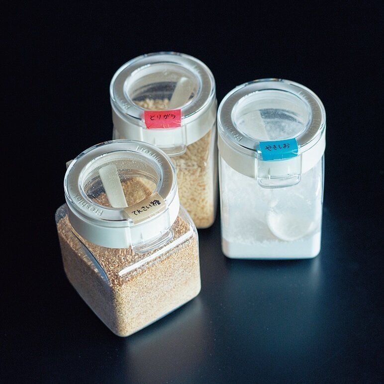 残量が見やすいから「あれ?中身がない!」と料理中に慌てません。色つきのラベルを貼っておけば、文字を読まなくても「青=塩」「赤=鶏ガラスープの素」と直感的に手に取れます。