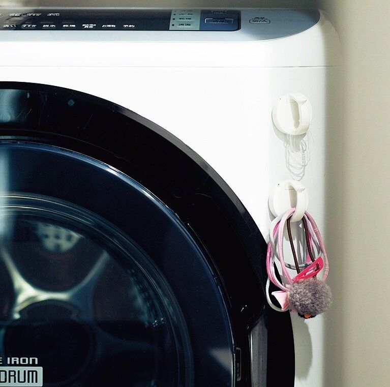 長年愛用しているレックの「輪ゴム掛け(マグネット付き)」は、下のほうのヘアゴムも片手でさっと取れる優れもの。子どもが取りやすいよう、洗面台のすぐ脇にある洗濯機にペタリ。