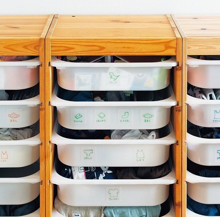 子どもが迷わず取り出せるのは、ぴっちり密閉されたケースより、うっすら中身がわかるケースのほう。毎日使う物ばかり収納しているので、ホコリも気にならず、使いやすい!