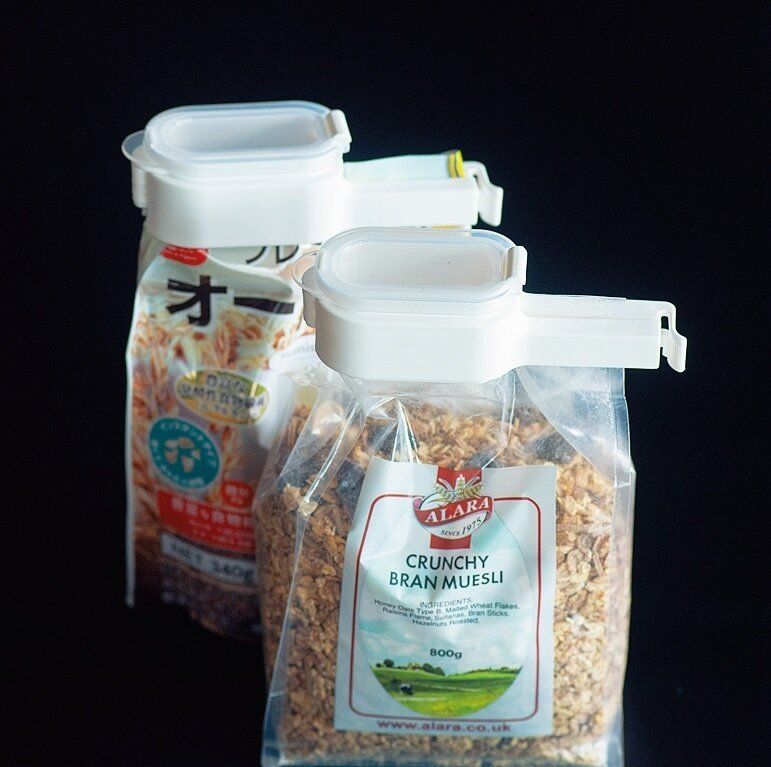 セリアの「注ぎ口付き袋クリップ」を取りつけて、シリアルなどの袋入り食品を使いやすく保管。ストックの買い出しを家族に頼むときも、「これ買ってきて」とパッケージを見せればOK。
