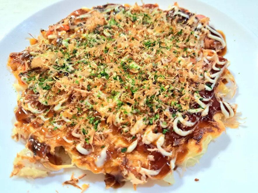 たとえば、写真のお好み焼きは、小麦粉250gに、だしの素を大1強入れ、水を360ml、卵2個を入れるだけ。水の量は野菜を混ぜたときの感覚で調節するといいのだとか。広島風であれば、キャベツやもやしもたっぷり入り、小麦粉やだしの素も少量ですむのでおすすなのだそう。