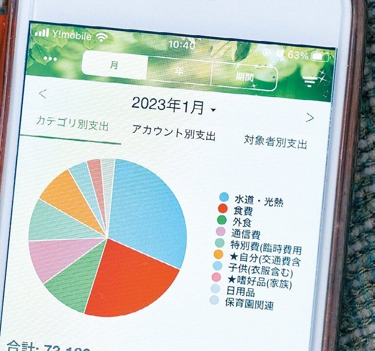以前は、家計を手書きでこまかく管理。今は移動中でも入力できるスマホアプリ「毎日家計簿」に100円単位でざっくり入力。週末、支出状況を確認するだけでも予算が守れるように。