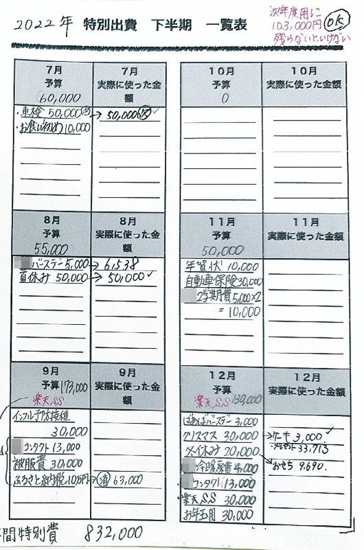 月ごとに、特別出費の予算と実際に使った金額を記入。その差額を調整して翌年の予算を立て、事前に備えているので、貯蓄がキープできます。「”必ずかかるお金”が見えていると、やりくりのモチベーションも上がります!」。