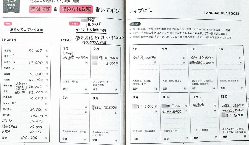 細かい家計管理は苦手。手帳に、生活費の月平均額、特別出費の予定を書き出し、月々にならして予算取りしたら、管理が快適に!年間出費を把握するだけでも、使い過ぎの防止になり、貯蓄額も安定しました。