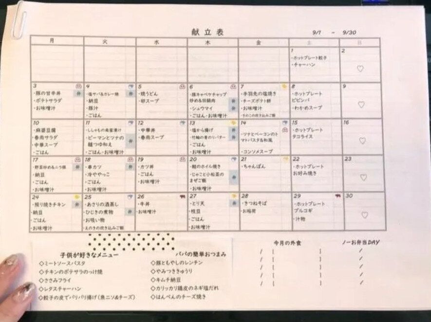 食品ロスを出さない工夫。これだけでも、大きな食費の節約につながりますね。このお友達も、4人家族で毎月7万円以上もかかっていたのが、この献立表のおかげで4万5千円くらいになったのだそう!