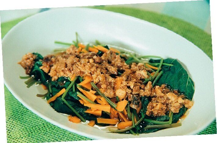 「サツマイモの葉は、煮ても炒めてもおいしい台湾の万能野菜です」。にんじんと一緒にさっとゆでて、カルディのルーローハン缶をのせるだけで手軽に台湾の味を再現!