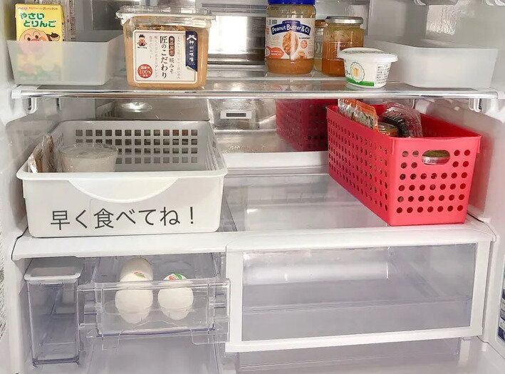 結さんの方法は、「早めに食べるボックス」をつくること。まずは冷蔵庫からみてみましょう。冷蔵室、野菜室、冷凍室と各スペースに1つずつボックスをつくるのがおすすめです。