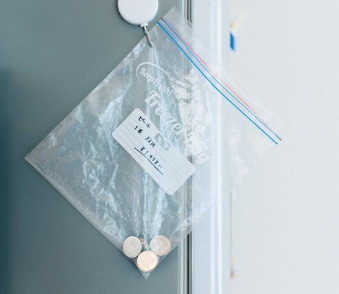 ビールを飲むときは冷蔵庫横の集金袋に、1本につき100円をIN。「お互いの小遣いから出すようにすれば、自然と飲む本数をセーブできます」。