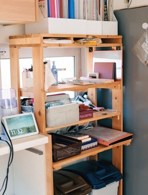 「下をゴミ箱置き場にし、上はダイニングに置きたい雑多な物をしまえる棚が欲しい」と夫にオーダー。手作りだから、置きたい場所にぴったり合うサイズで作れるのが魅力。