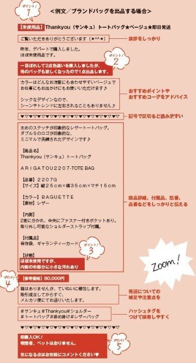 商品について正確に買い手に伝わることはもちろん、より魅力的に感じられる説明文を意識しましょう。毎回、最初から説明文を書くのが大変な人は、文例をスマホのメモ機能やアプリのテンプレート機能に入れておき、商品ごとにカスタマイズするとラク♪