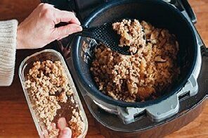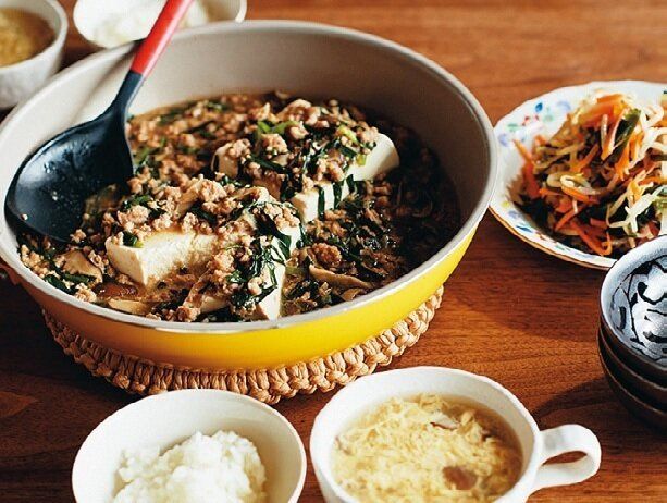 土曜日に下味をつけて、日曜日に使ったひき肉の残りは、まとめて肉みそに。肉みその半分を麻婆味にしてその日に食べ、残りは冷蔵室で保存。金曜日の炊き込みご飯に使います。どちらも味の系統が違うしっかり味だから、「またこのおかず?」なんて言わせません!