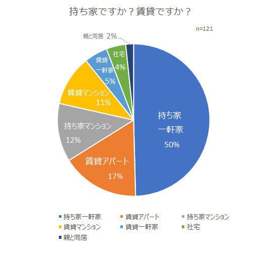 つぎに、“持ち家ですか?賃貸ですか?”という質問には、過半数が一軒家やマンションを所有する「持ち家」と回答しました。そのなかでも、「持ち家一軒家」が全体の50%を占めトップに。賃貸派は「アパート」暮らしが多いようです。