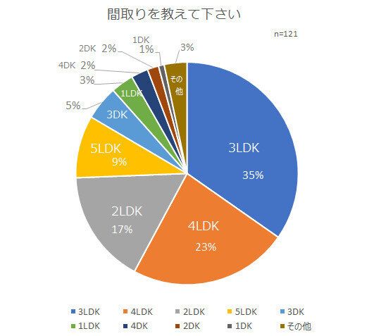 最後に、住んでいる家の部屋数を確認するため、“間取りを教えてください”という質問をしました。しかしこの回答に大きな開きはなく、いちばん多くの票を集めた「3LDK」でも、35%となっています。