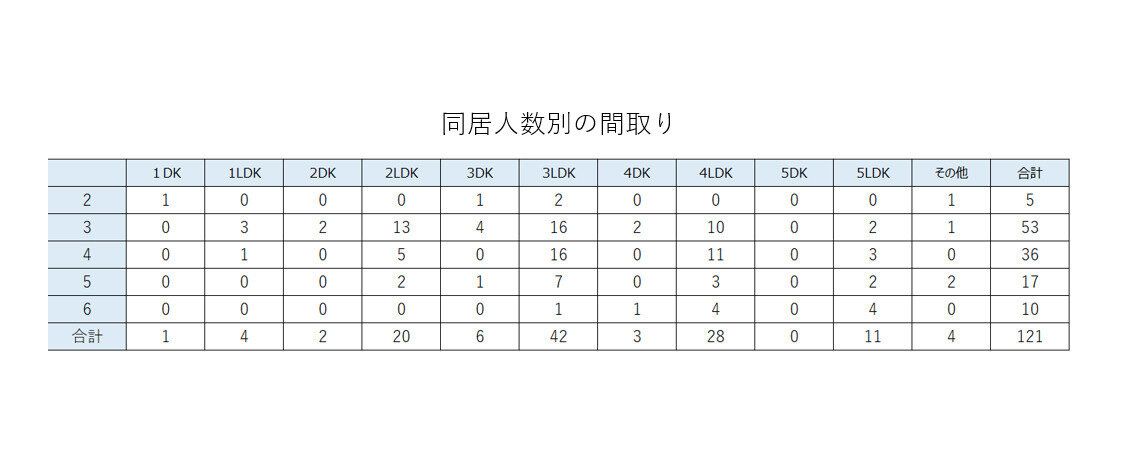 実際に同居人数別の間取りを見たところ、人数に関係なく「3LDK」は人気のようでした。しかし、同居人数が5~6人になると「4LDK」や「5LDK」が増えるように。同居人の数と間取りは強く関係がありました。