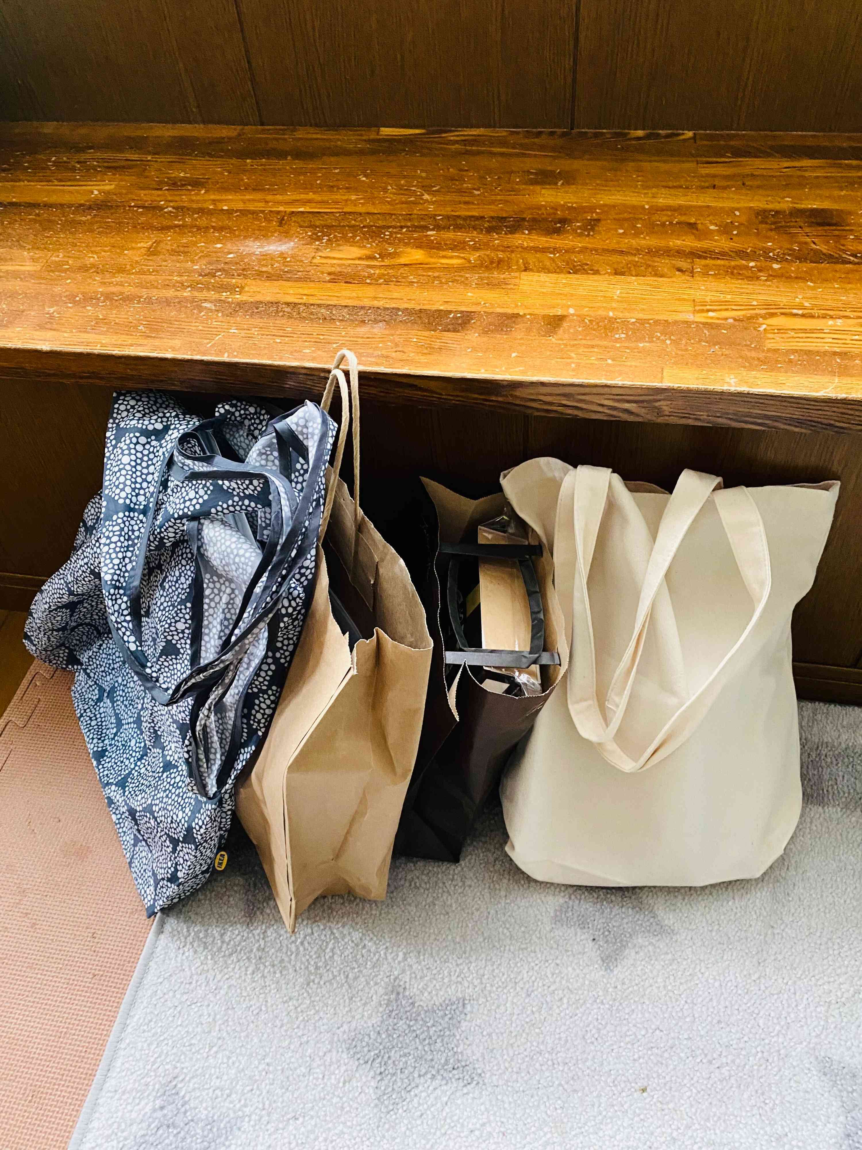 全体的に家の中のモノが多いお宅でよくある現象なのですが、部屋のあちこちに紙袋やエコバッグがいくつも並んで置かれていることがよくあります。