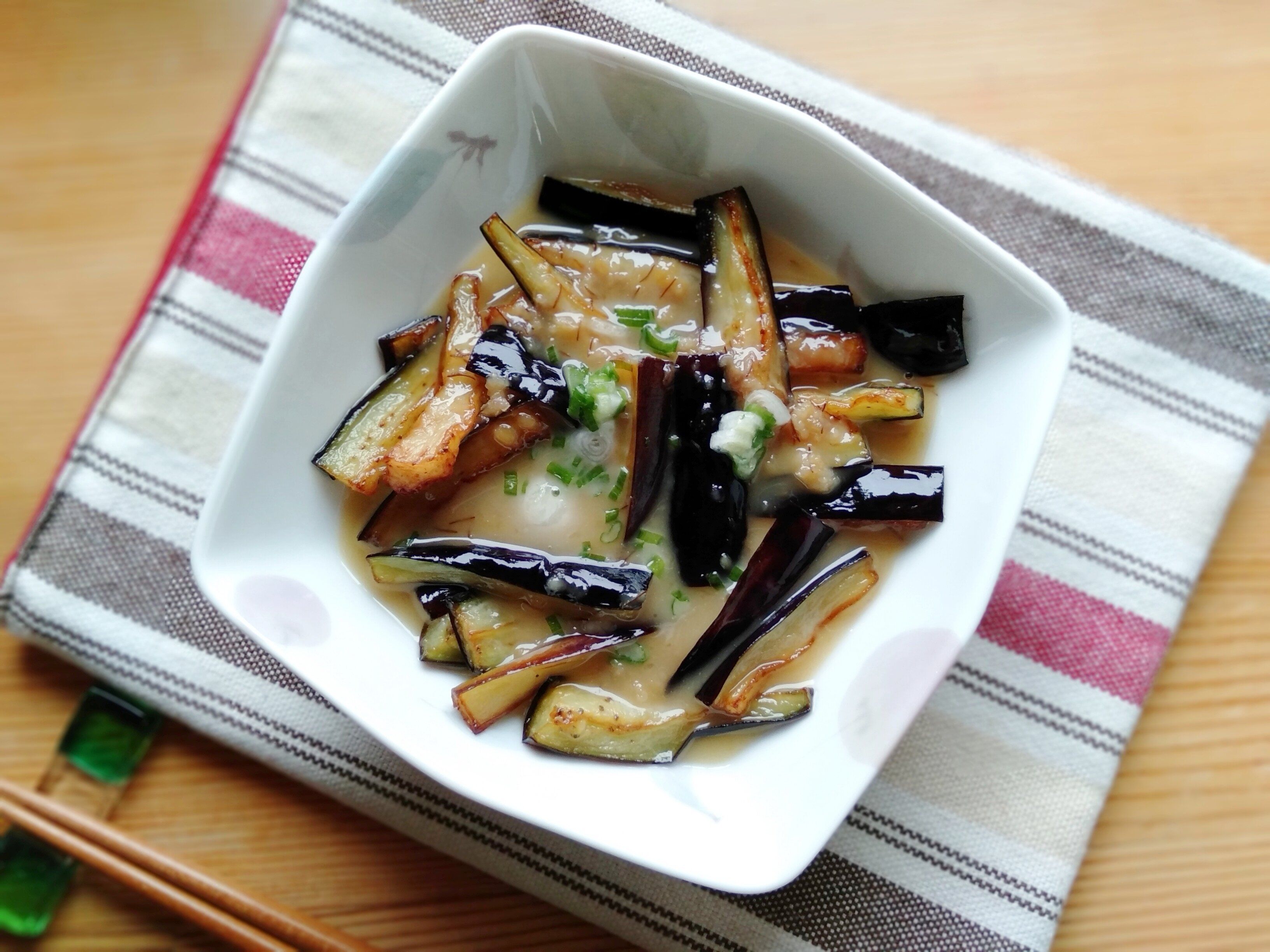 3.茄子を器に盛り、1をかけ、ネギを散らしてでき上がりです。