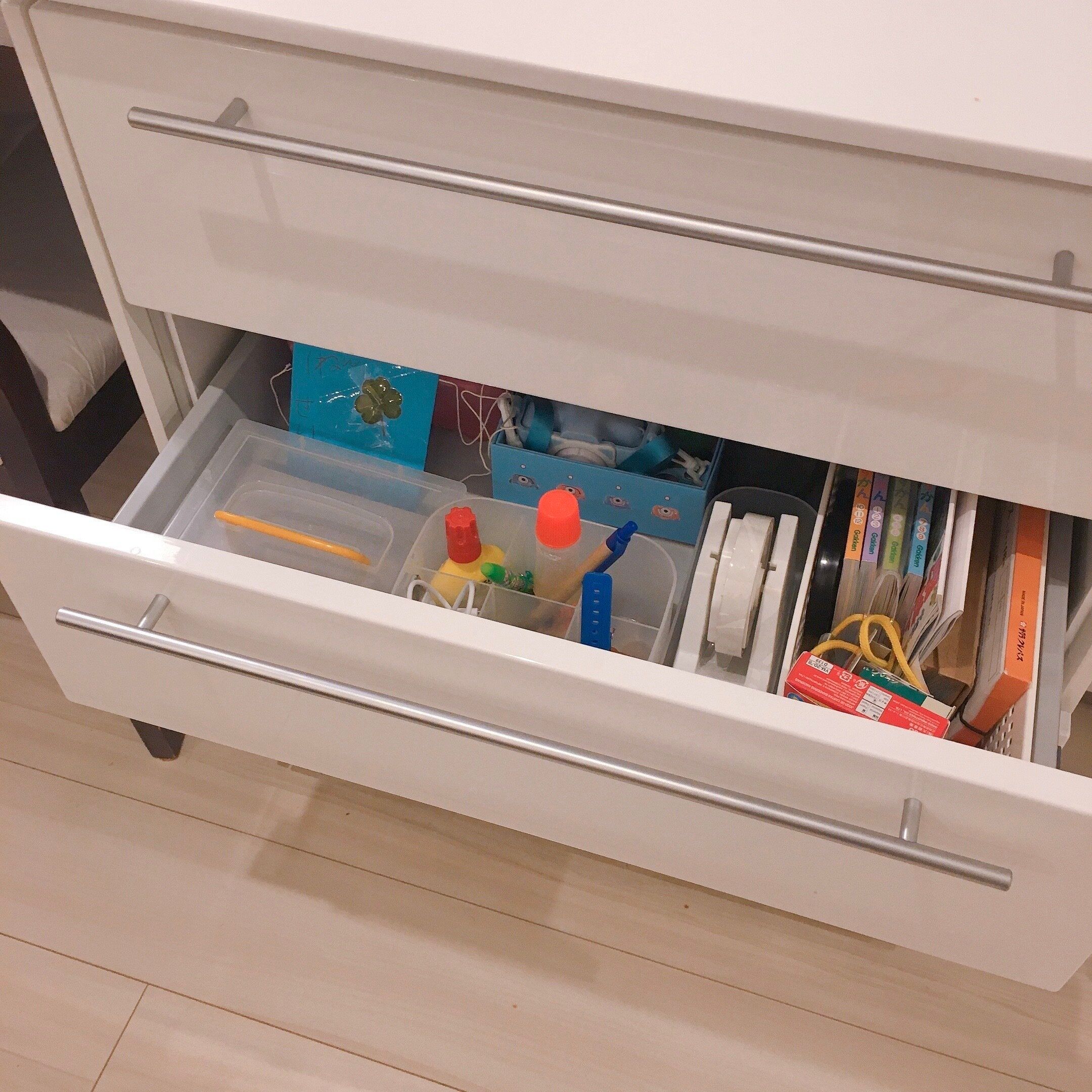 我が家では小5の娘、小1の息子用にリビングに引き出しを一つずつ用意して、自分のモノを収納するスペースを作っています。娘はお友達からもらったお手紙や自分の財布やお気に入りのノート、デジカメなどを入れています。息子はリビングで工作をする時に使うハサミや折り紙のセットやよく読む本などを収納しています。