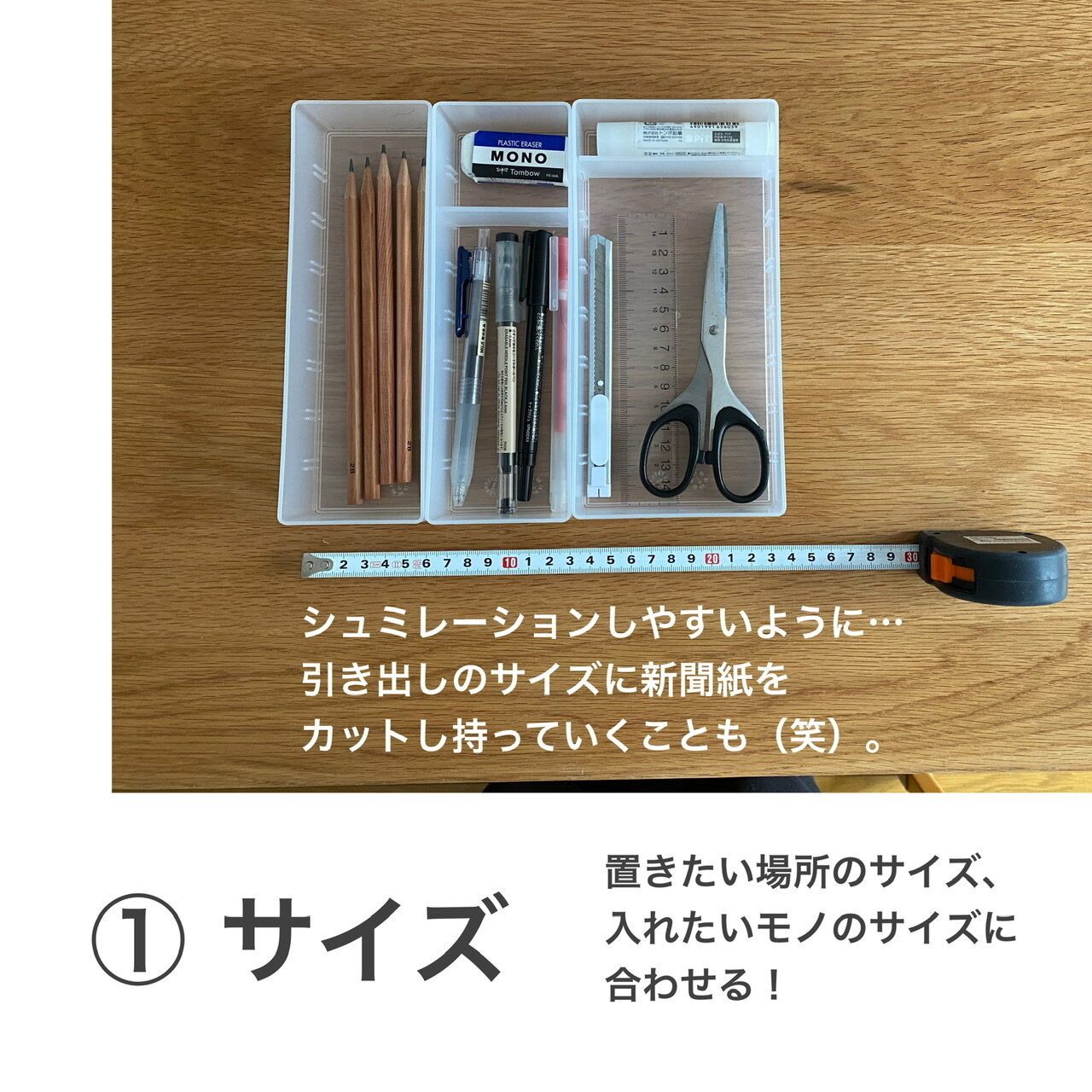 私の個人的なやり方ですが、引き出しのこまかい収納グッズを買いたいときなどは、サイズのメモだけでなく、あらかじめ新聞紙を引き出しサイズの大きさに切ったものをお店に持ち込っていったりしてシミュレーションすることもあります。