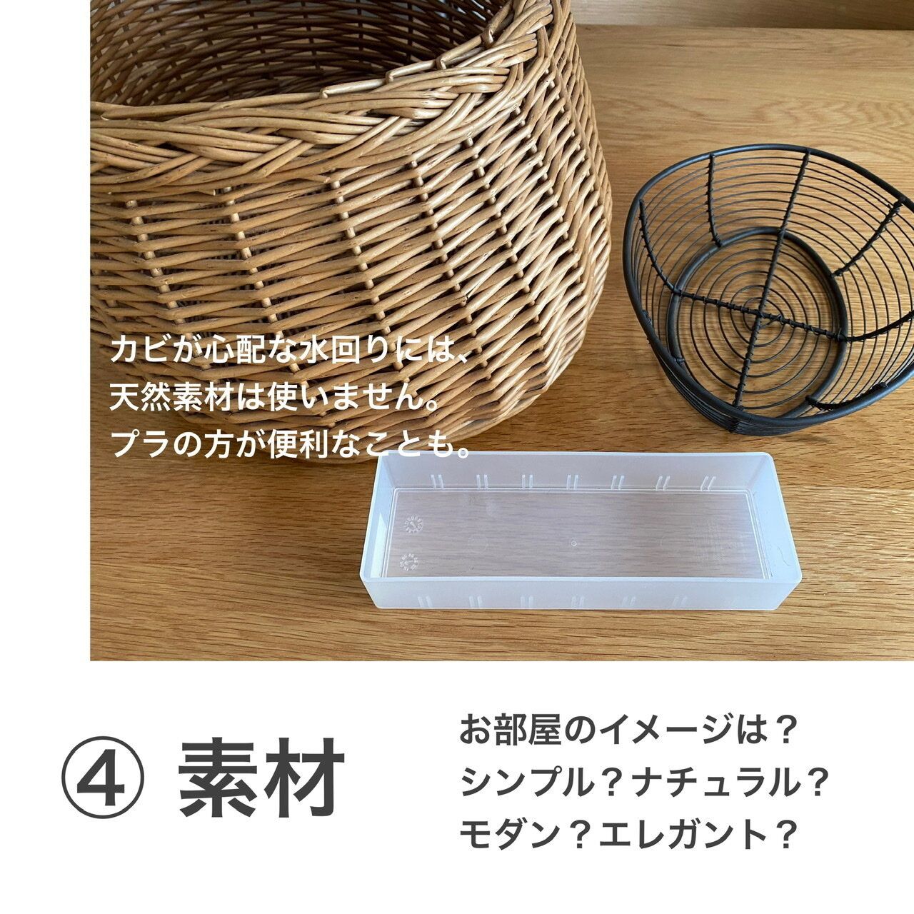 また収納用品を置く環境にも考慮して素材を選ぶべきです。