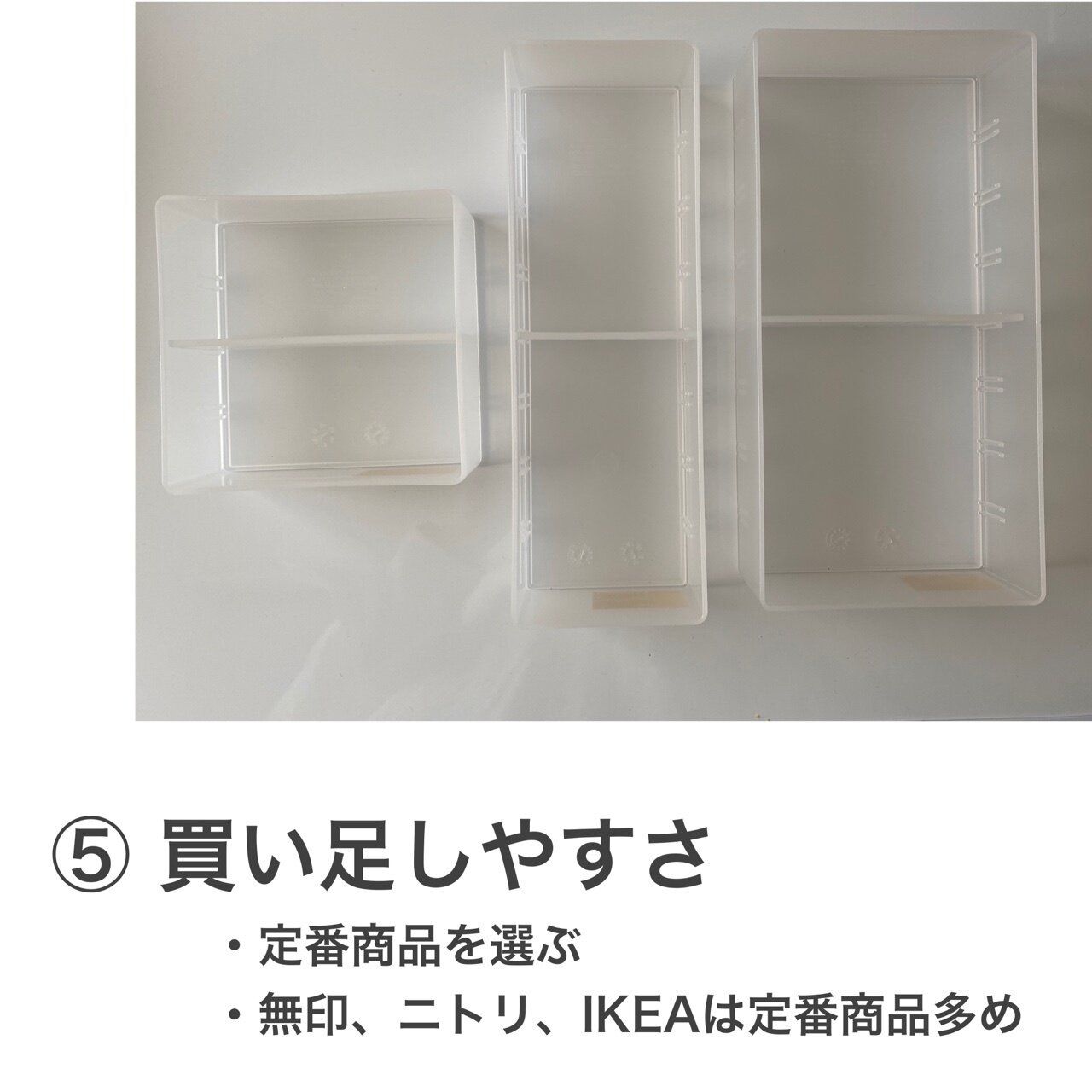 定番商品なら、買いたしたいときに買いたすことができます。無印良品やニトリのファイルボックスやヴァリエラIKEAなどでは定番商品が手に入りやすいので、わが家でも多用しています。